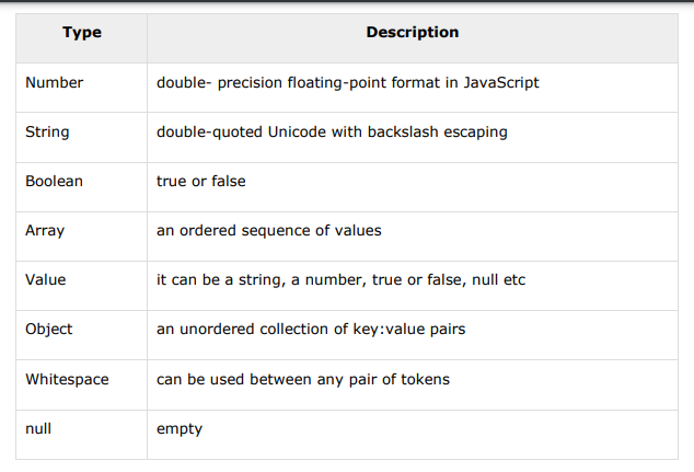 - Values can be strings, numbers, objects, arrays, booleans, or null.