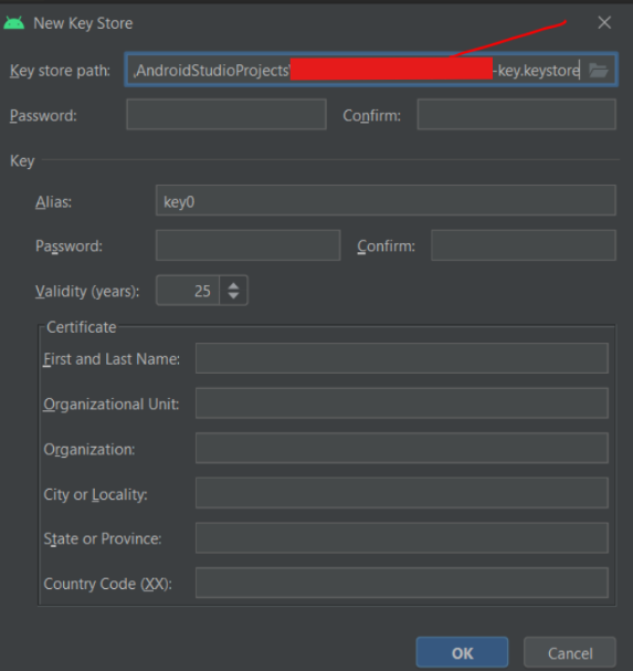 If you haven’t already created a keystore, you’ll need to do so now. Follow the prompts to choose a location for your key store and set a password. If you’ve already created a keystore, select ‘Choose existing’ and navigate to its location.
